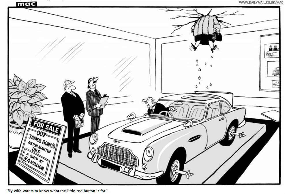3. In Thunderball, Bond abandons his Aston Martin DB5 mid-mission to fly off in a rocket-pack. He almost certainly got his car towed for abandoning it in a 'no parking' zone.